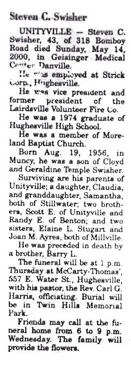 Steven C. Swisher, 43, of 318 Bomboy Road, Unityville, died Sunday, May 14, 2000, in Geisinger Medical Center, Danville.